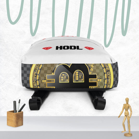 White Self Made Bitcoiner Backpack with HODL on the outside zipper area and bitcoin logos inside pocket & Bottom of backpack